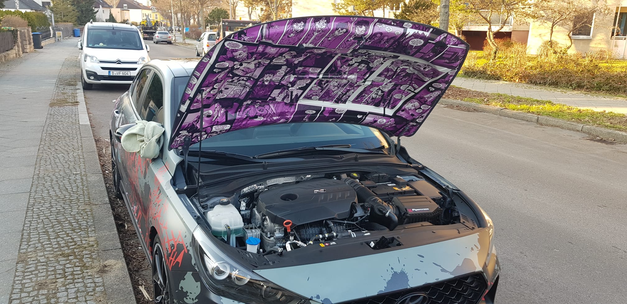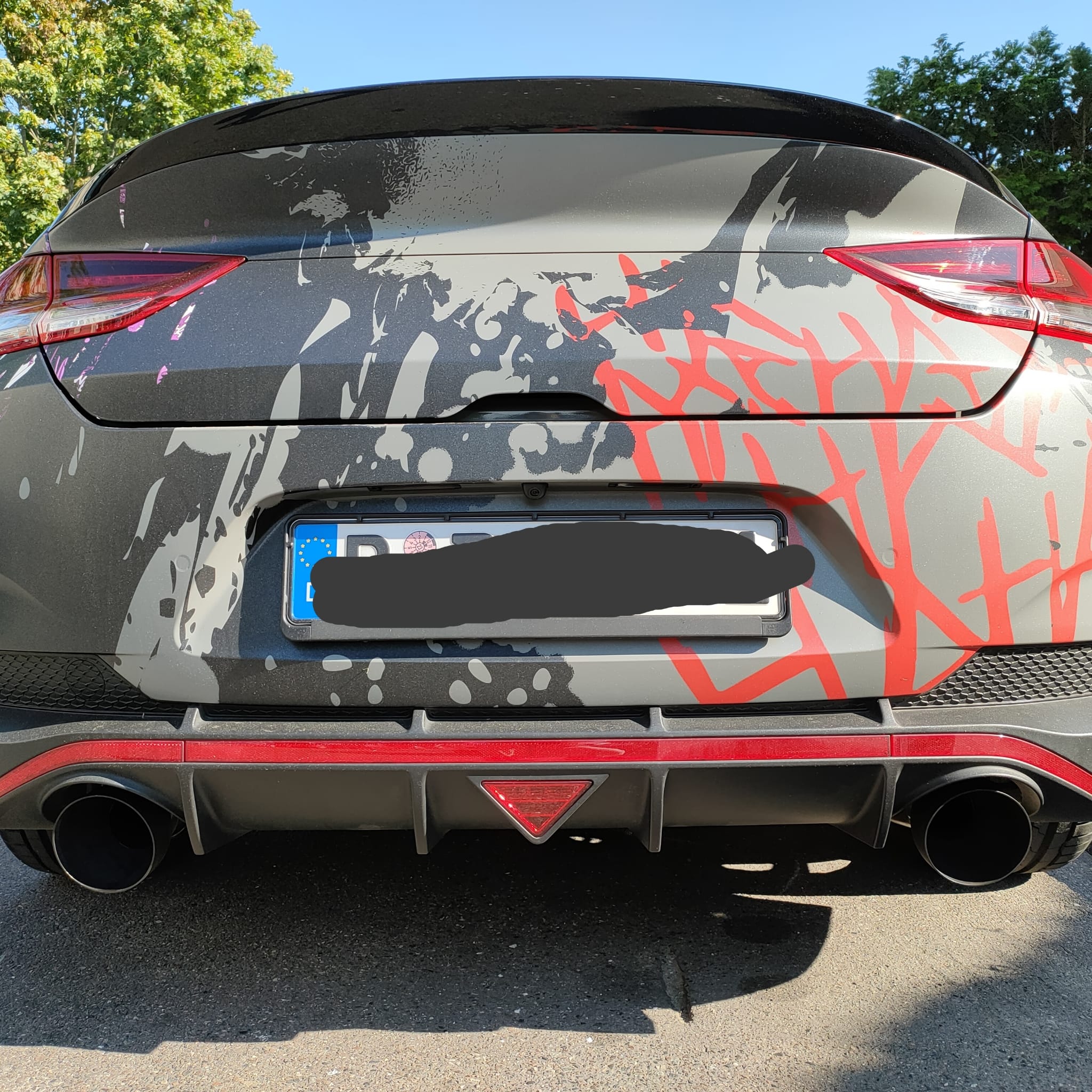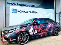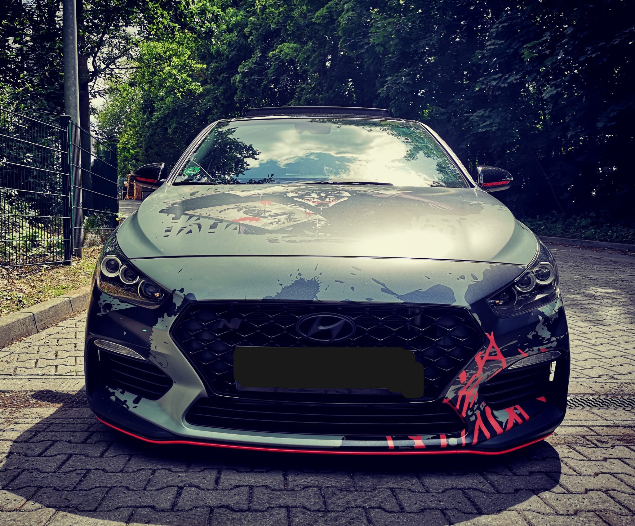 Folierung(matt, mit Glitzerflocken) außen, Umrandung Frontgrill und Innenseite der Motorhaube von MS-Carbon Folien Design, Pipercross Sportluftfilter, Haubenlifter von Hyundaizubehör, Sommerräder 19Zoll von Brock, Endrohre von Gruppenzwang (mattgrau lackiert), Lenkrad Emblem in mattschwarz, Ambiente Beleuchtung von Lotus Lantern, LED Sonnenblenden und Kofferraum in grün von Benzinfabrik.